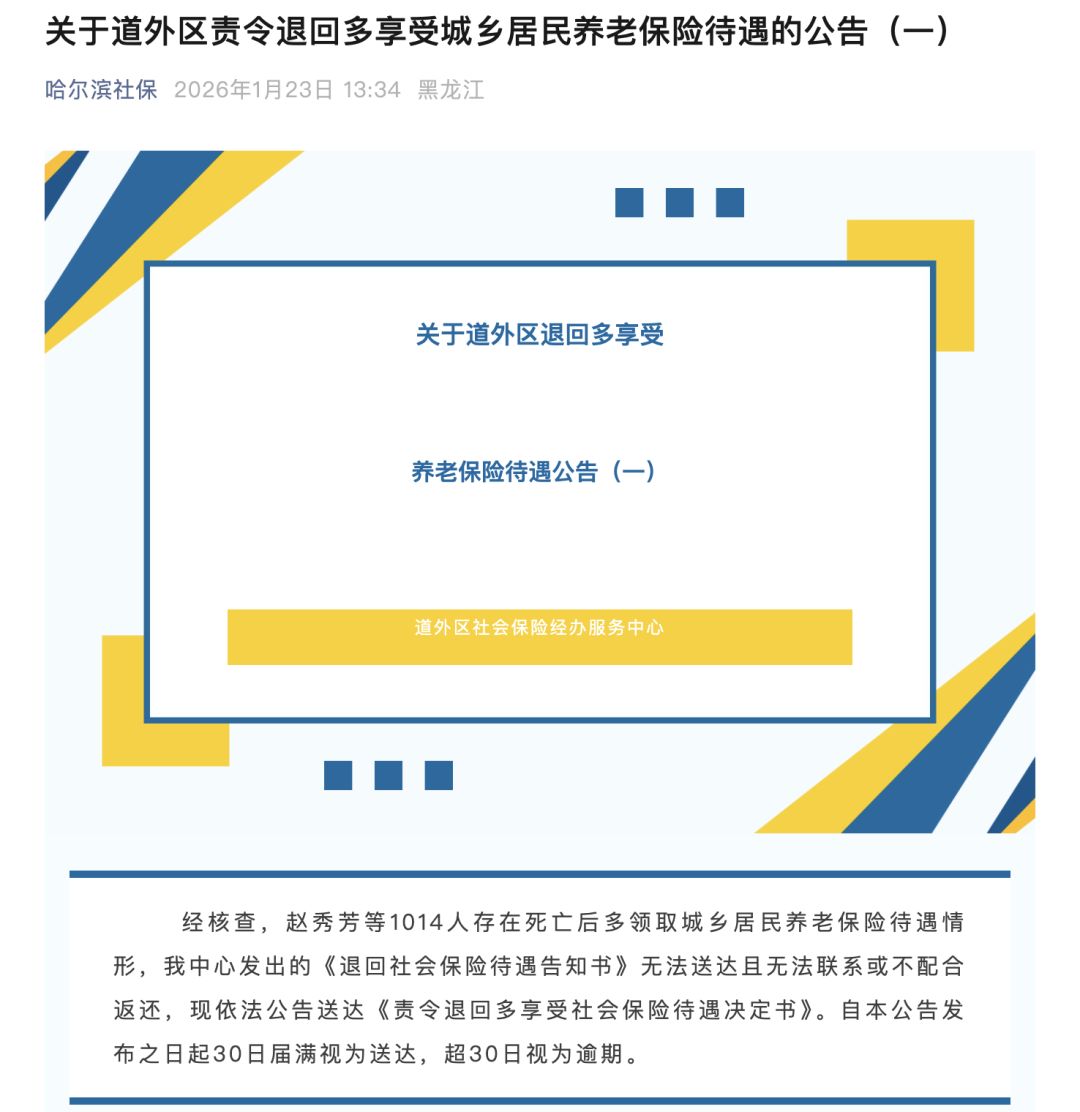 黑龙江哈尔滨市社会保险事业中心官方微信公众号“哈尔滨社保”1月23日发布“关于道外区责令退回多享受城乡居民养老保险待遇的公告”七星配资 。