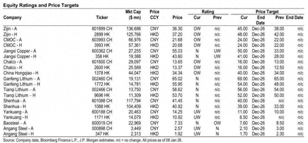 在个股方面,小摩表示,由于紫金矿业的铜/金业务敞口,该股仍是其在2026年的首选。基于对铜的积极看法,该行将江西铜业港股的评级上调至“中性”,尽管该股近期超过40%的股价涨幅似乎已基本消化收购SolGold的影响。